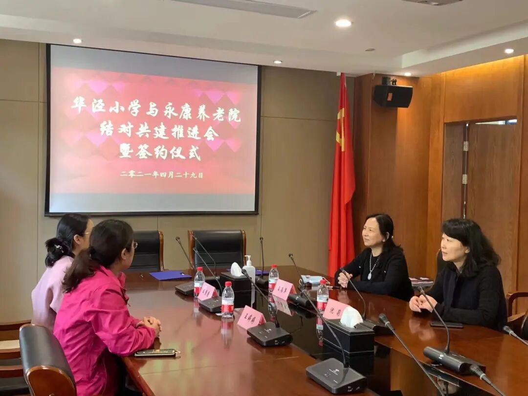 4月29日中午,华泾小学党支部书记兼校长王海萍和华泾小学副校长沈莉校长来到徐汇区永康养老院举行结对共建签约仪式。